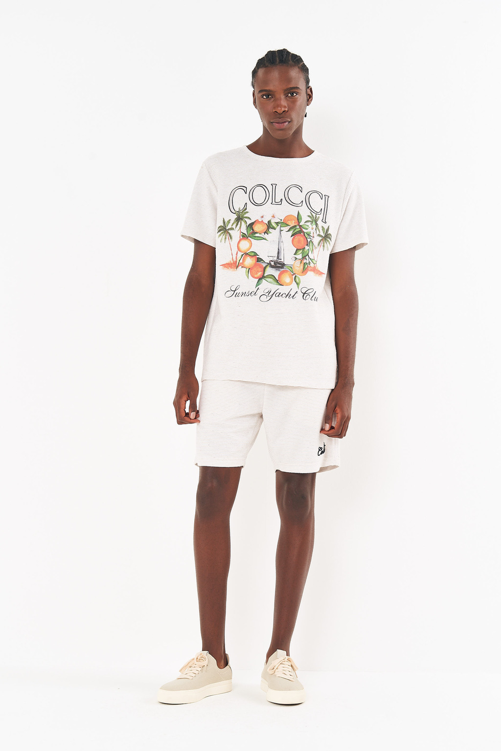 • Para um look coordenado e com a cara da Riviera, combine com a camiseta listrada da mesma coleção e tênis casuais em tom neutro, como na imagem.