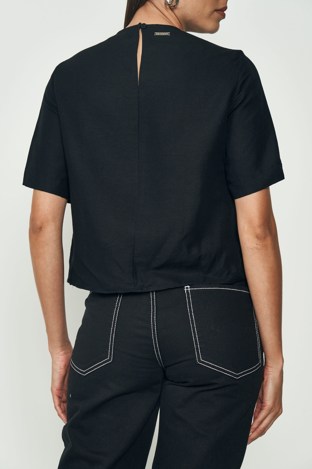 Blusa: Modelagem reta com caimento soltinho, manga curta, decote redondo, detalhe de corrente nos ombros.