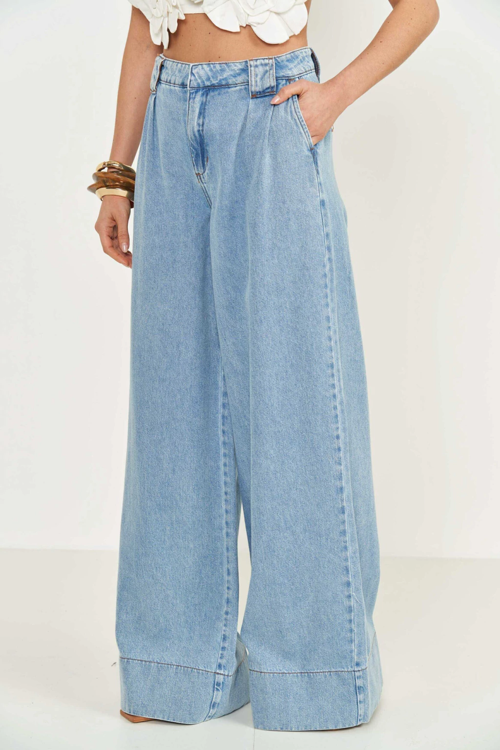 Design: Modelagem pantalona (pernas muito largas e retas) e cintura alta, com pregas frontais que conferem volume e fluidez.